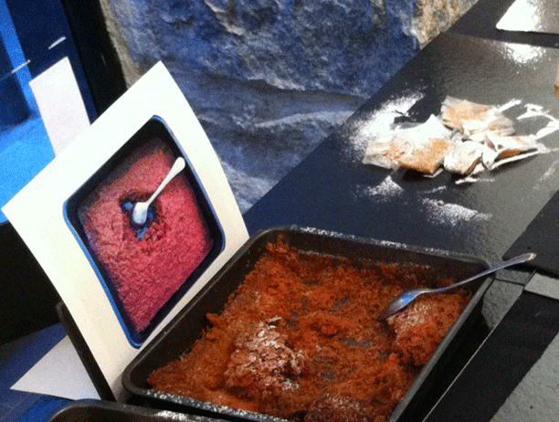 Para esta ocasión se realizó una serie de acciones con guiños a sensaciones, muestras de materiales y paredes o separaciones de espacios. La bebida fue una fuente continua de metales líquidos y una zona de obras nos prepara y situa en el evento. Dispuestos a construir y degustar con estos materiales comestibles nos introdujimos de lleno en una atmósfera expositiva y gastrotectónica.